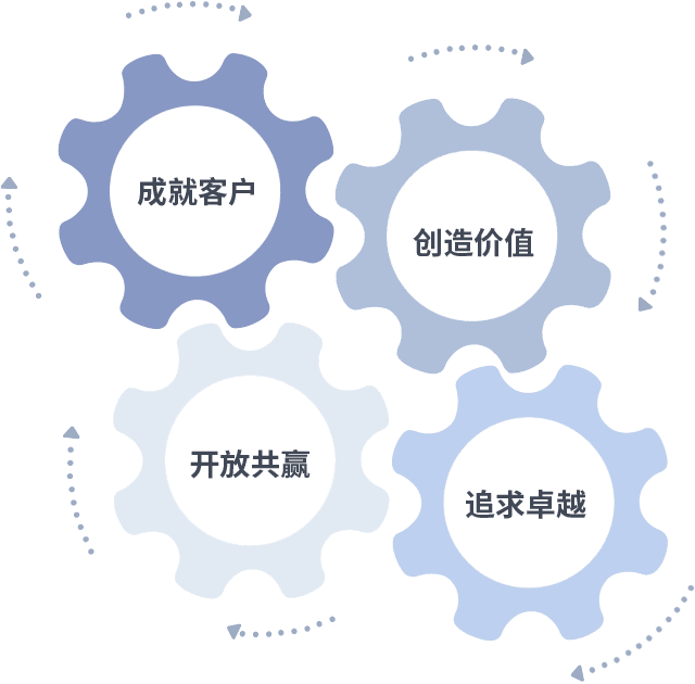 成就客户是一切决策的出发点,,创造价值是衡量所有工作的标准,,追求卓越是我们做事做人的态度,,开放共赢是我们的格局也是最终的结果。。。价值观的齿轮环环相扣,,推动着组织里的每个人不断向前。。。